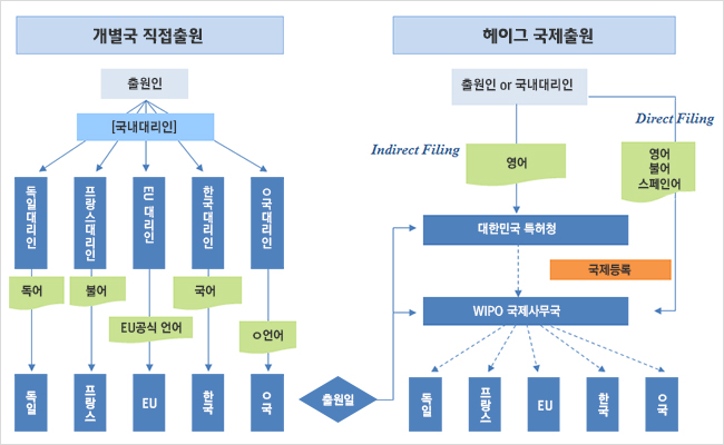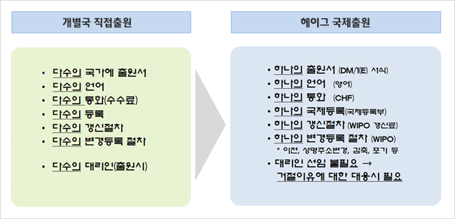 따라서 헤이그 시스템에서는 하나의 국제출원이 복수의 관청에 제출해야 하는 일련의 출원을 대체할 수 있음