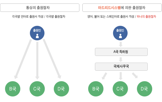 - 국내에서 등록받거나 출원한 상표가 있으면, 이를 기초로 하나의 언어로 작성된 하나의 국제출원을 하나의 본국관청에 제출하고 한번의 수수료를